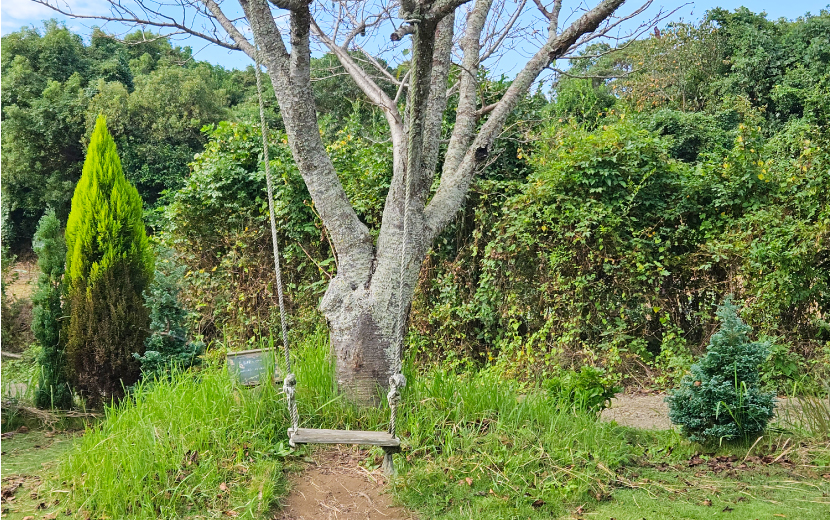 散策の途中、木の枝で作られたブランコを発見。「これは乗りたい!」と思ったのですが…残念ながらお子さま専用でした(笑)。
