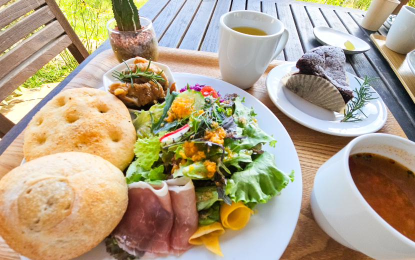 ランチは焼きたてパンとハーブティー。おやつにチョコケーキをいただきながら、秋の風を感じていたその時——足元にねこちゃん登場。ギョッ。たいていの人なら「かわいい〜」と喜ぶのでしょうが、私はどうしても苦手派。