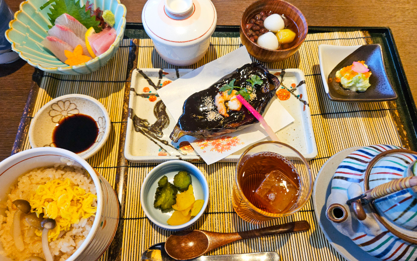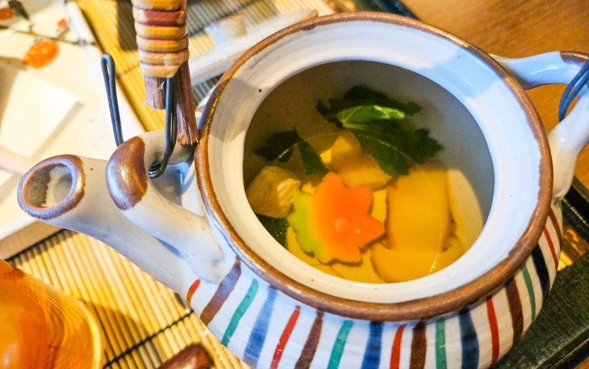 季節を味わう土瓶蒸し御膳。街の中の小さな庭園で、ほっとひと息。