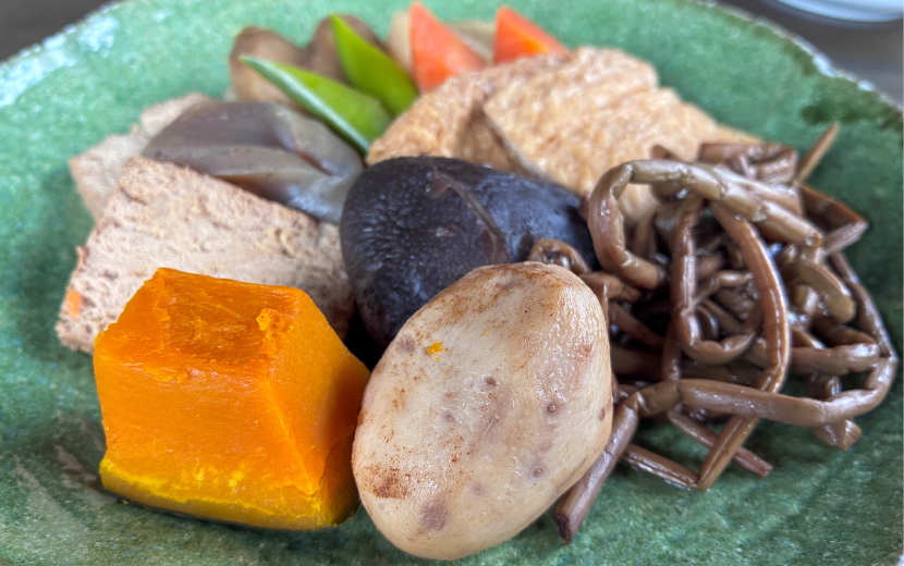 熊本県小国町、瀬の本高原にある 八菜家 へ。ここに来ると、自然と選んでしまうのが、だご汁定食とお煮しめ。湯気の立つだご汁は、ひと口で体の芯までじんわり。地産地消の野菜を使ったお煮しめも、やさしい味わいです。お漬物がバイキング形式なのもうれしくて、気づけば「もう腹いっぱい」。体も気持ちも、すっかり温まりました。